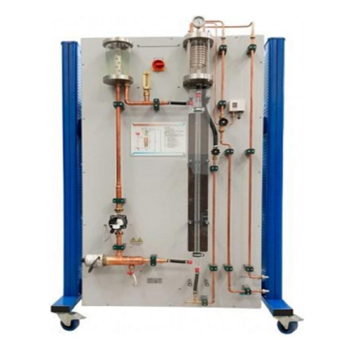 Entraîneur de processus d'évaporation WL 210 Équipement de formation professionnelle Équipement de laboratoire de transfert de chaleur Lors de la génération de vapeur, le milieu qui doit s'évaporer passe par différentes formes d'écoulement en fonction de la zone de transfert de chaleur. Le milieu s'écoule dans un évaporateur tubulaire sous forme de fluide et sort de l'évaporateur tubulaire sous forme de vapeur surchauffée. En pratique, la vapeur d'eau générée dans les grands systèmes est utilisée par ex. pour installations de chauffage ou entraînements de machines. Pour concevoir des générateurs de vapeur, il est important de connaître le processus d'évaporation avec les crises d'ébullition afin d'assurer un fonctionnement fiable. Les crises d'ébullition sont causées par une détérioration soudaine du transfert de chaleur, la densité de flux de chaleur élevée entraînant une augmentation dangereuse de la température de la paroi. L'unité expérimentale WL 210 permet d'examiner et de visualiser le processus d'évaporation sous ses différentes formes d'écoulement. Cela se fait en chauffant le liquide d'évaporation, R1233zd, dans un évaporateur tubulaire en verre. Comparé à l'eau, ce liquide a l'avantage que son point d'ébullition se situe à env. 18°C (1013hPa), où l'ensemble du processus d'évaporation se déroule à des températures beaucoup plus basses et une puissance de chauffage plus faible. La pression peut être modifiée via le circuit de refroidissement. Une pompe à jet d'eau évacue le circuit d'évaporation. Spécification visualisation de l'évaporation dans un évaporateur tubulaire milieu de chauffage et de refroidissement : eau alimentation en eau via le réseau du laboratoire ou via WL 110.20 Refroidisseur d'eau pour assurer une température d'eau maximale de 16°C évaporateur tubulaire en verre à double paroi circuit de chauffage avec réchauffeur, pompe et vase d'expansion soupape de sécurité protège contre la surpression dans le système pompe à jet d'eau pour évacuer le circuit d'évaporation réfrigérant R1233zd, GWP : 1 Données techniques Puissance nominale du réchauffeur : 2kW plage de température : 5 …80°C Fluide de chauffage et de refroidissement : eau Pompe 3 étages max. débit : 1,9m3/h max. : 1,5 m consommation électrique : 58 W longueur de l'évaporateur du tube : 1050 mm diamètre intérieur : 16 mm diamètre extérieur : 24 mm Condenseur : tube spiralé en cuivre Réfrigérant R1233zd GWP : 1 volume de remplissage : 1,2 kg équivalent CO2 : 0 t Plages de mesure pression : - 1…1,5bar rel. température : 0…100°C 230V, 50Hz, monophasé 230V, 60Hz, monophasé 120V, 60Hz, monophasé UL/CSA en option